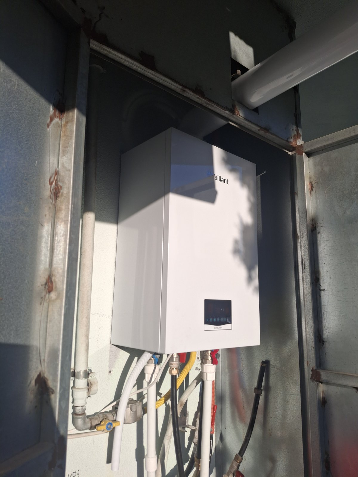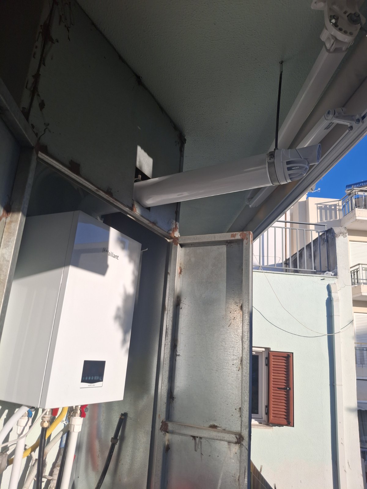 Τοποθέτηση νέου επίτοιχου λέβητα αερίου 24kW Vaillant, πλήρως συνδεδεμένου στο υφιστάμενο δίκτυο θέρμανσης και ζεστού νερού χρήσης.